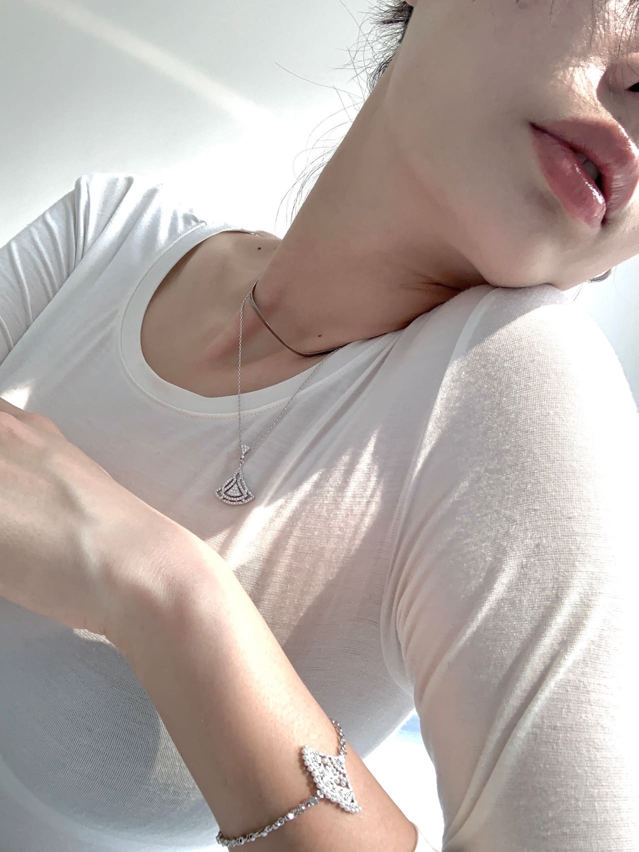 光影是这组写真的另一位主角。摄影师巧妙运用侧光与轮廓光,在她面部与身体轮廓上雕刻出立体的光影诗行。当她微微侧首,光线从斜面打下,在鼻梁、颧骨与锁骨处投下细腻阴影,肌肤的质感与光影的层次被无限放大。这种处理手法,不仅强化了画面的戏剧张力,更仿佛为她镀上了一层思考的沉静光泽,让观者的视线不由地跟随光的方向,去探寻她眼底的故事。